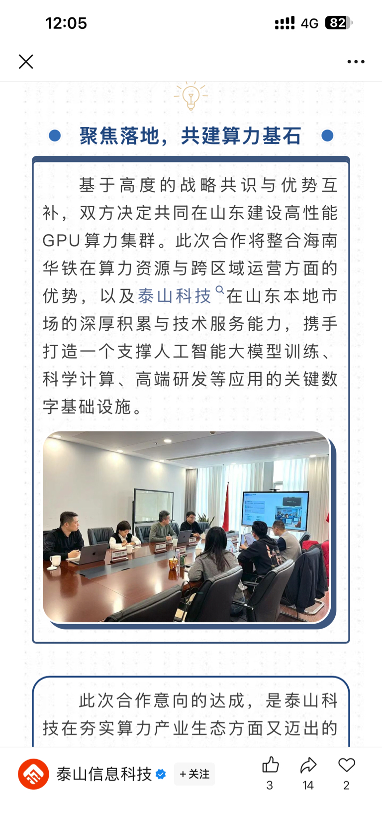 $海南华铁(SH603300)$ 基于高度的战略共识与优势互补,双方决定共同在山东建设高性能GPU算力集群。此次合作将整合海南华铁在算力资源与跨区域运营方面的优势,以及泰山科技在山东本地市场的深厚积累与技术服务能力,携手打造一个支撑人工智能大模型训练、科学计算、高端研发等应用的关键数字基础设施。