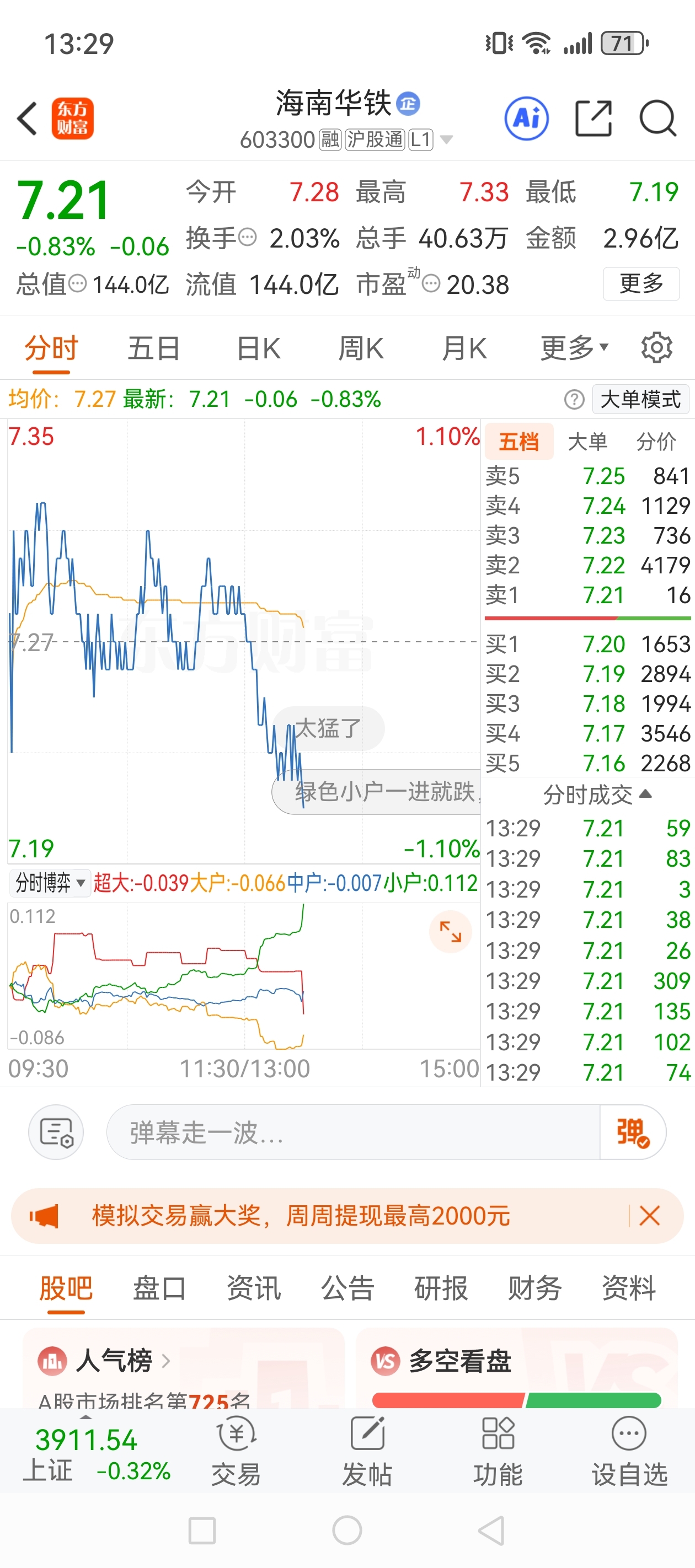 $海南华铁(SH603300)$ 绿色小户一进就跌,大户超大户中户都走了