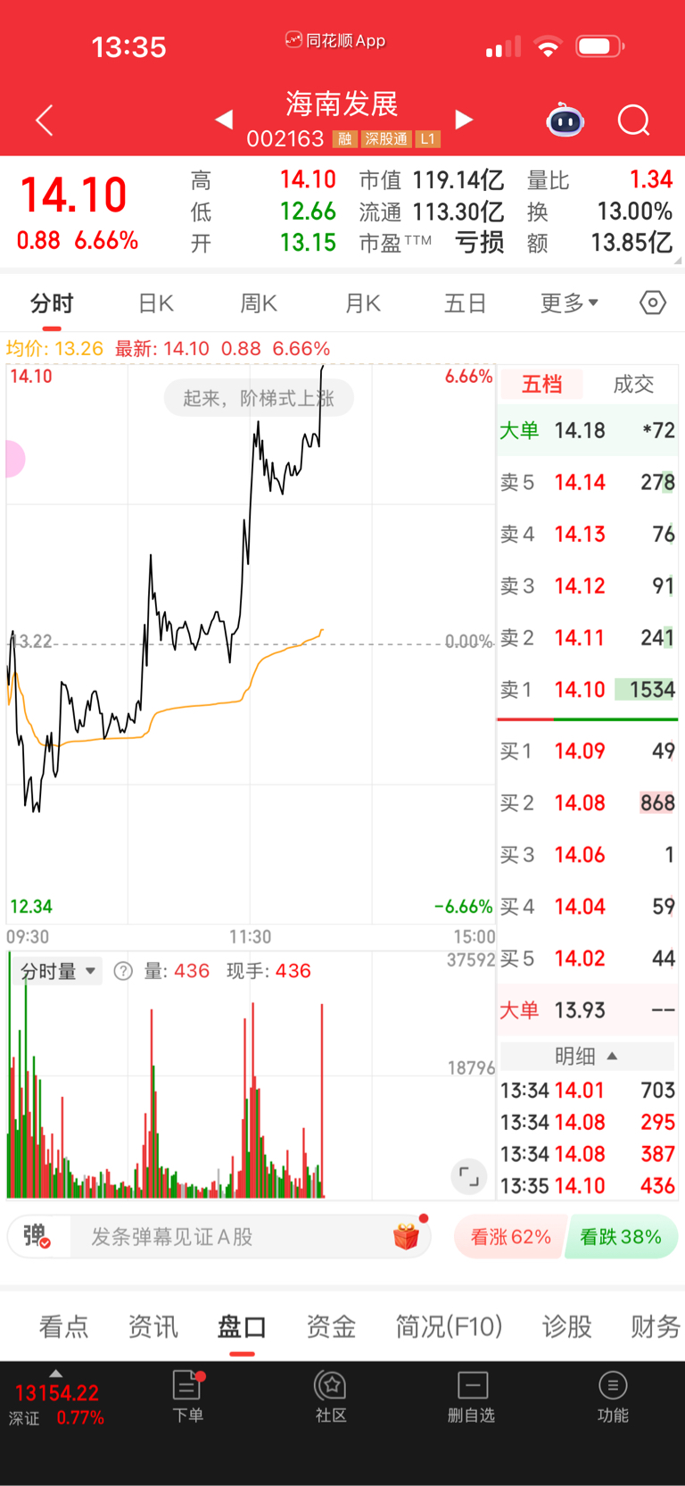 海南发展跌4点多倒涨6点多,涨7点了,海南自贸区又大涨了。华铁又熊了,海南自贸区
