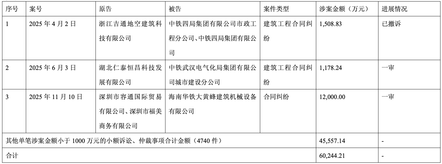 1月6日,海南华铁(603300)发布公告,截至本公告披露日,公司及子公司连续十二个月内累计发生的诉讼、仲裁事项涉案金额合计为60,244.21万元,占公司最近一期经审计净资产的9.81%。