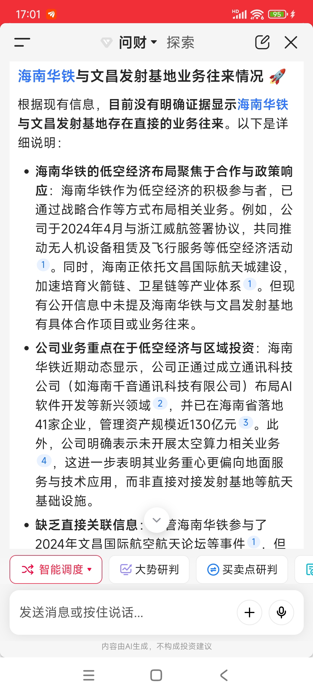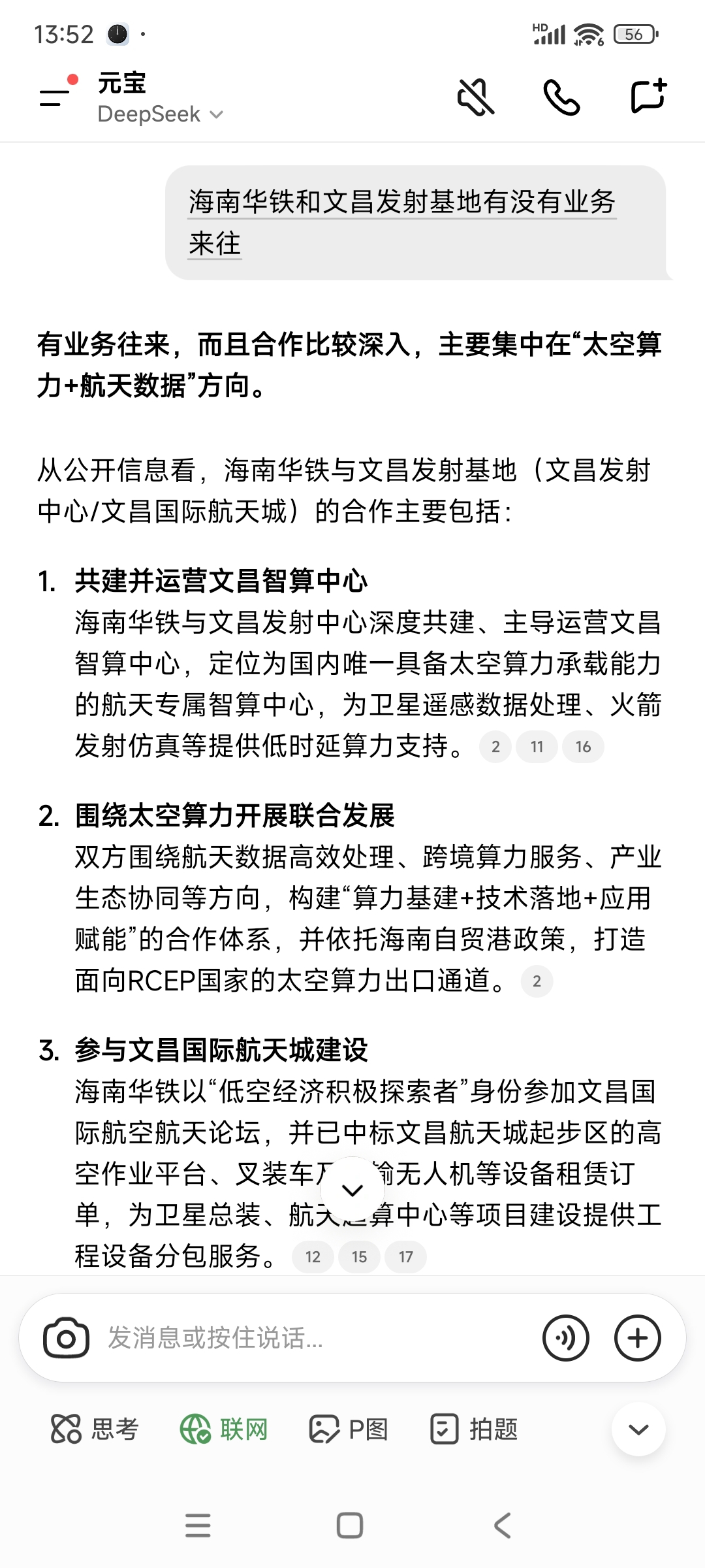 以上分别是元宝,deepseek,东方财富妙想和同花顺问财的回答,除了问财说没有业务来往,其他都回答有业务来往。我知道人工智能不靠谱,但是多希望它是真的,是不是公司被36亿的订单搞怕了,没有实锤的东西都不敢说。