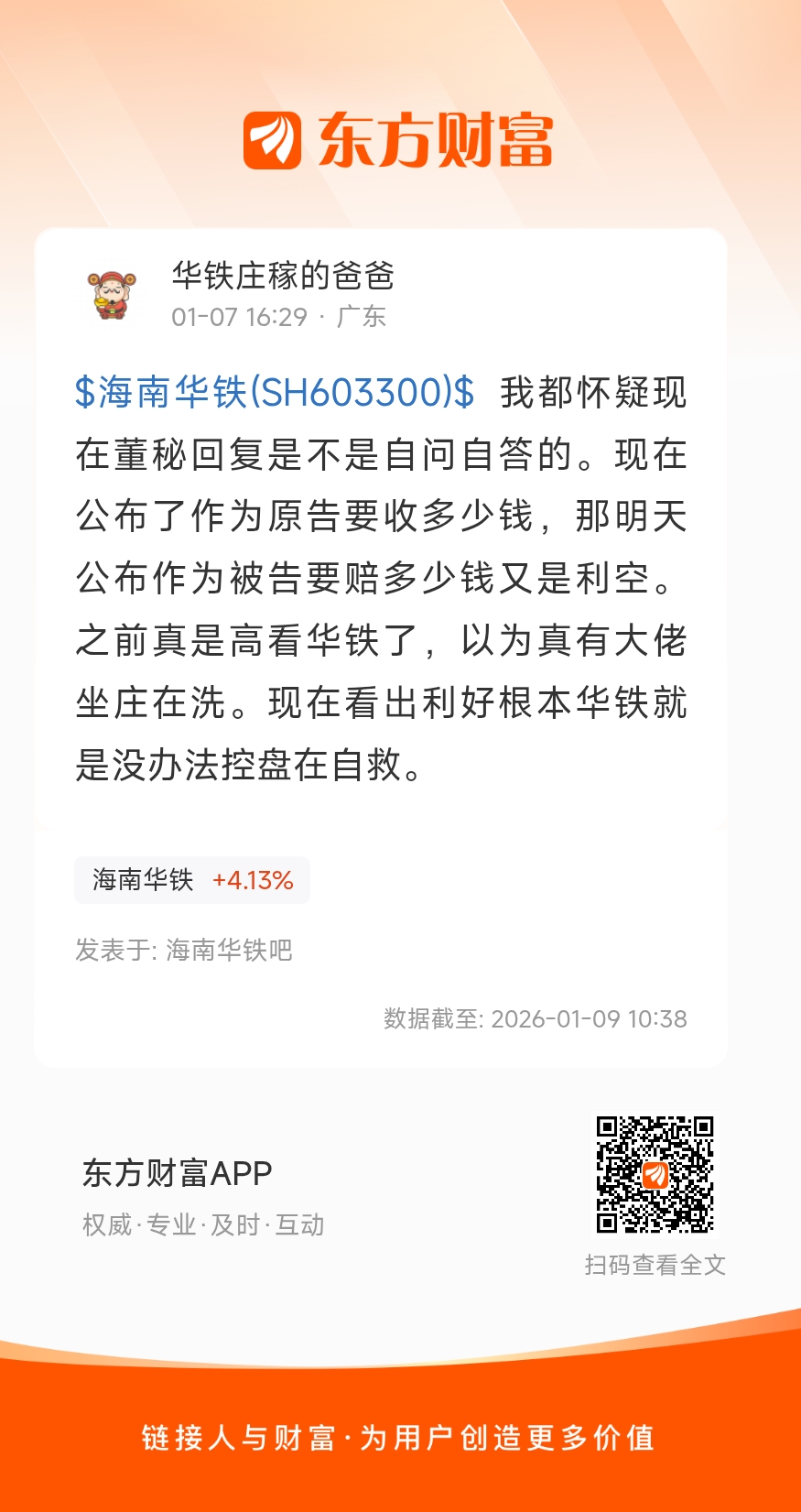 $海南华铁(SH603300)$ 我都怀疑现在董秘回复是不是自问自答的。现在公布了作为原告要收多少钱,那明天公布作为被告要赔多少钱又是利空。之前真是高看华铁了,以为真有大佬坐庄在洗。现在看出利好根本华铁就是没办法控盘在自救。