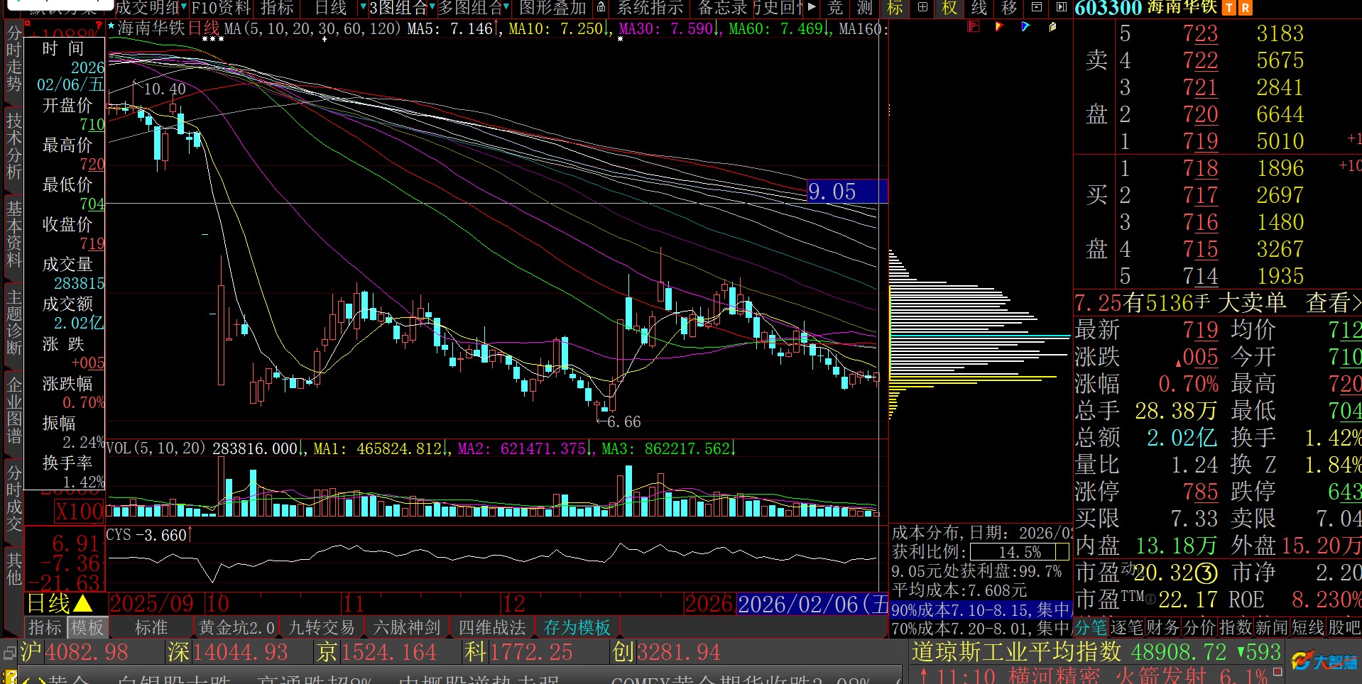 炒股不要白日做梦,因为目前海南华铁除非大的利好刺激,就它现在图形不可能大涨,因为里面没有庄家,庄家在上方先走了,现在只能是新的庄家建仓位置,大家仔细看看它上方有多少均线和筹码压制,但短期深跌概率也很小,但大盘暴跌除外。