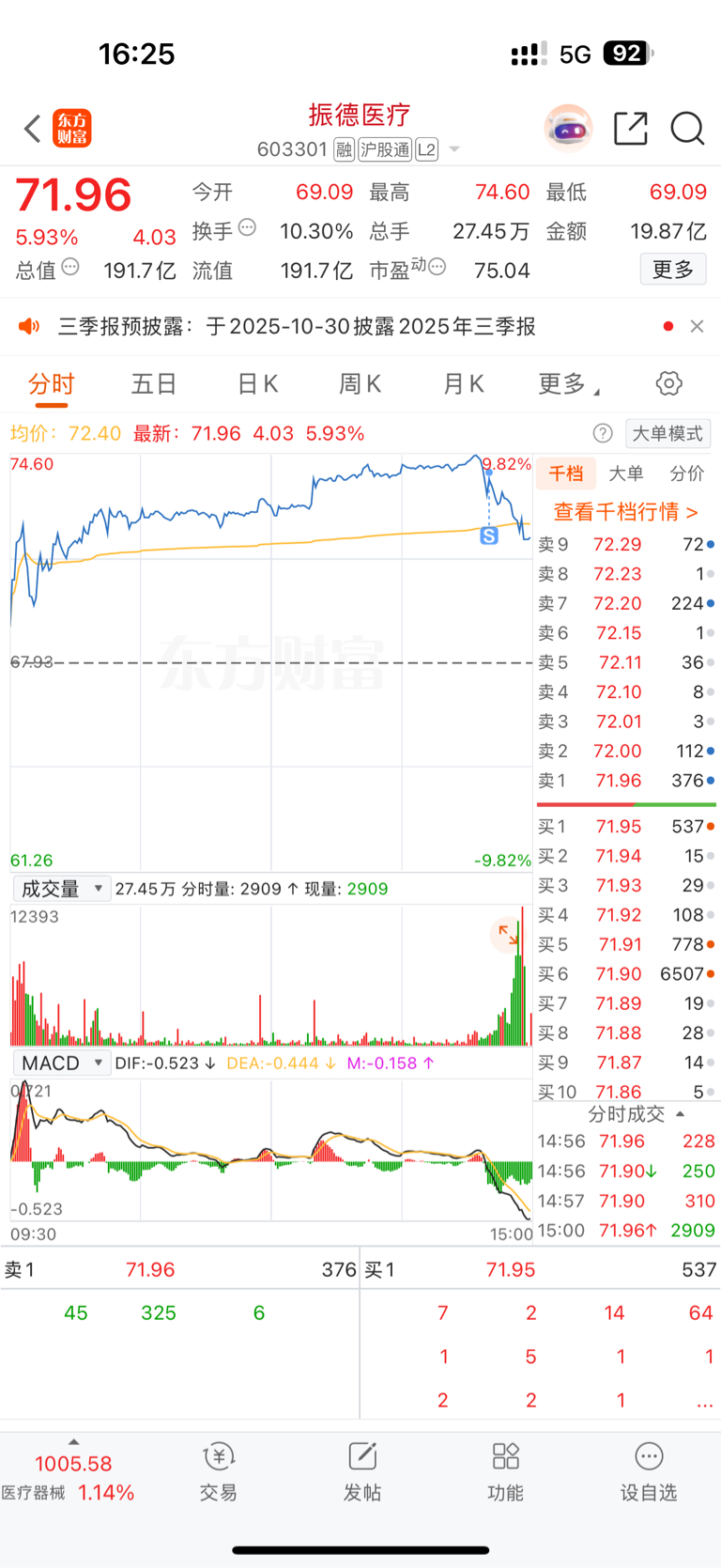 $振德医疗(SH603301)$ 周五进了300,今天走了200,留100明天看,不过今天放量明天大概率可能低开了