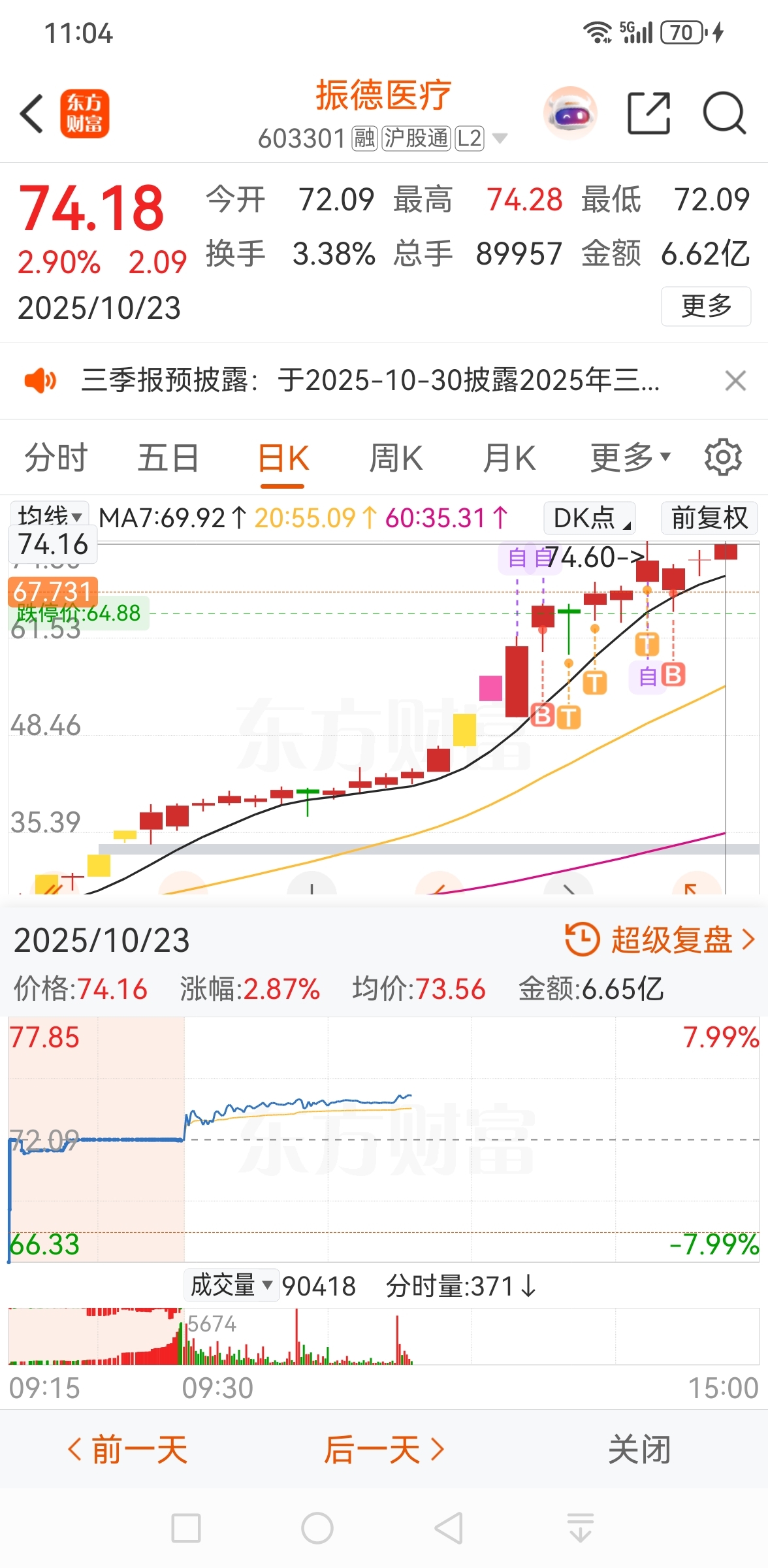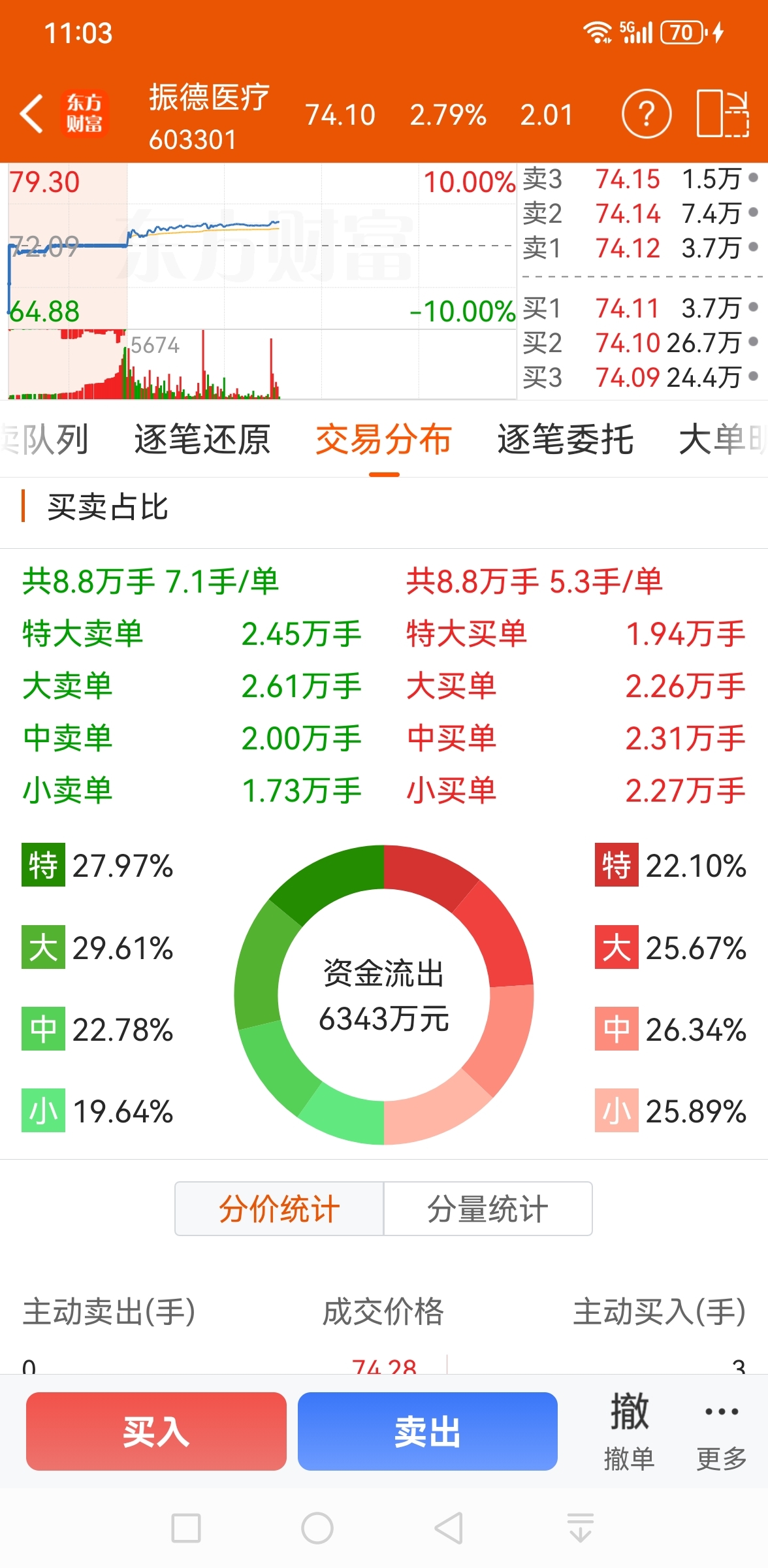 #实盘记录# 主力资金流出,散户进入,主力获利,股价拉升,今天能不能达到74.6元。尾盘可能跌至73.02左右。股市有风险,投资谨慎!