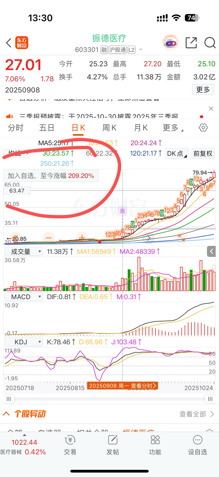 $振德医疗(SH603301)$ 真牛逼,30多个交易日就两阴线,一路目送翻倍再翻倍