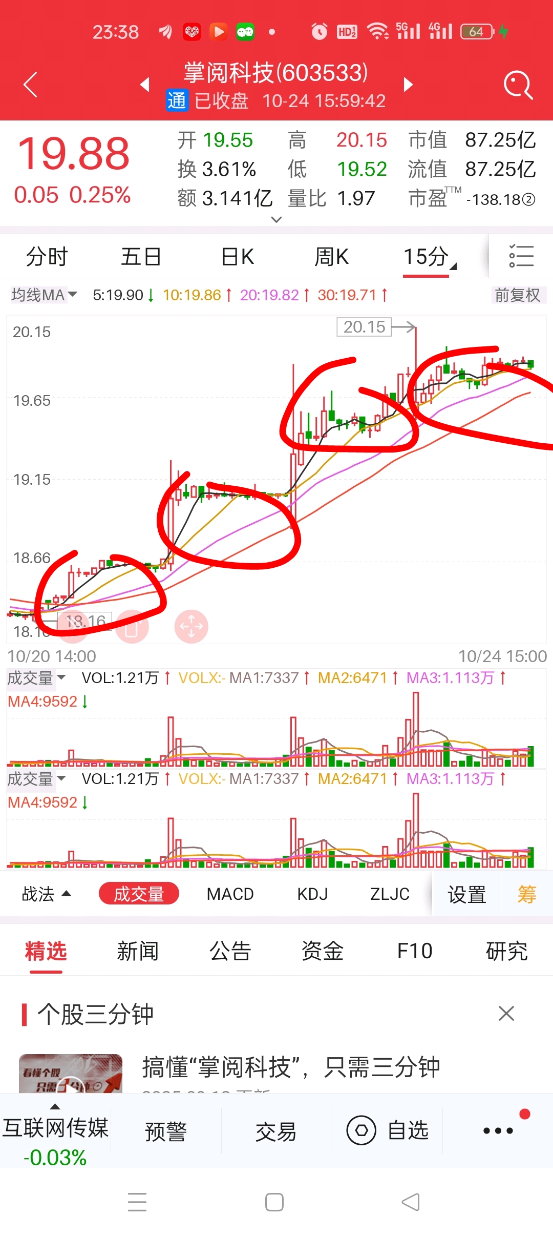 $振德医疗(SH603301)$ 看大家都在问我尾盘进的什么,那我就告诉大家,我今天尾盘进的是掌趣科技,看15分时庄控盘力度,见截图