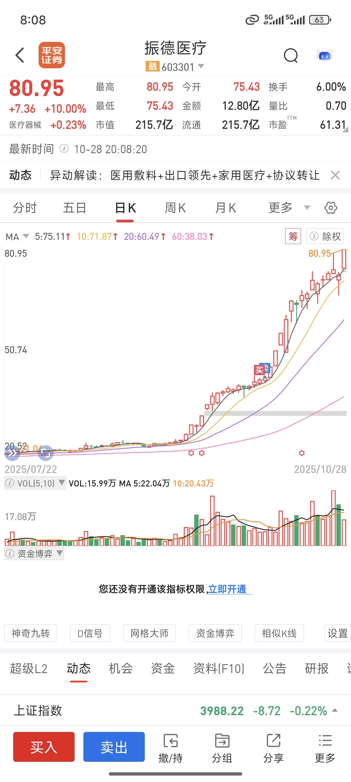 $振德医疗(SH603301)$ 当时还是小仓位买的,感觉走势很漂亮,但是感觉太高了,第二天小赚就跑了,没想到竟然买在半山腰