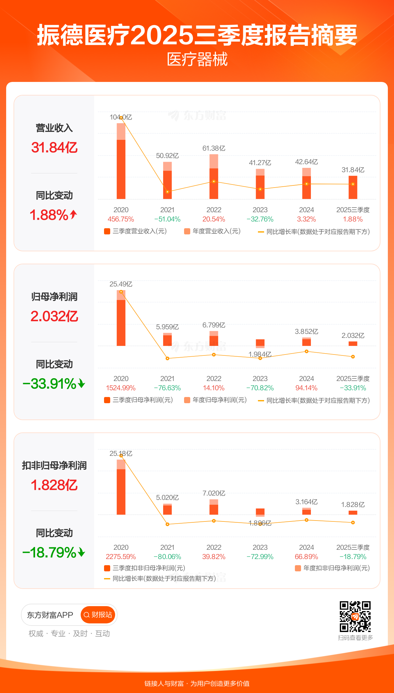振德医疗10月30日发布2025年三季报显示,公司前三季实现营业收入31.84亿元,同比增长1.88%;归母净利润2.03亿元,同比下滑33.91%;扣非归母净利润1.83亿元,同比下滑18.79%