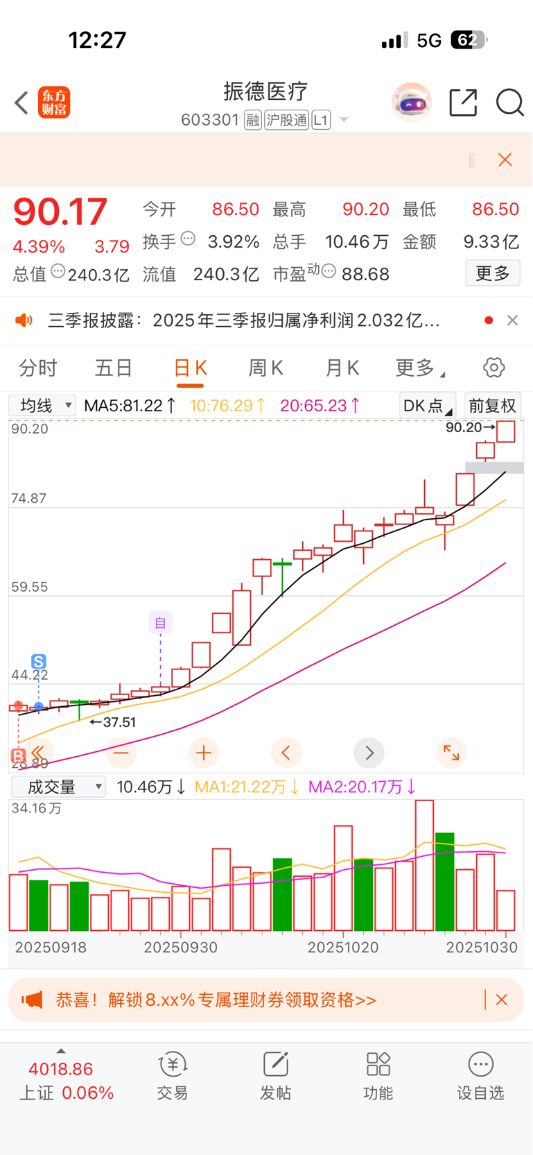 没赚到钱卖了以后,发现跌不下去,加自选就是不敢买,哈哈,一个月翻了一倍