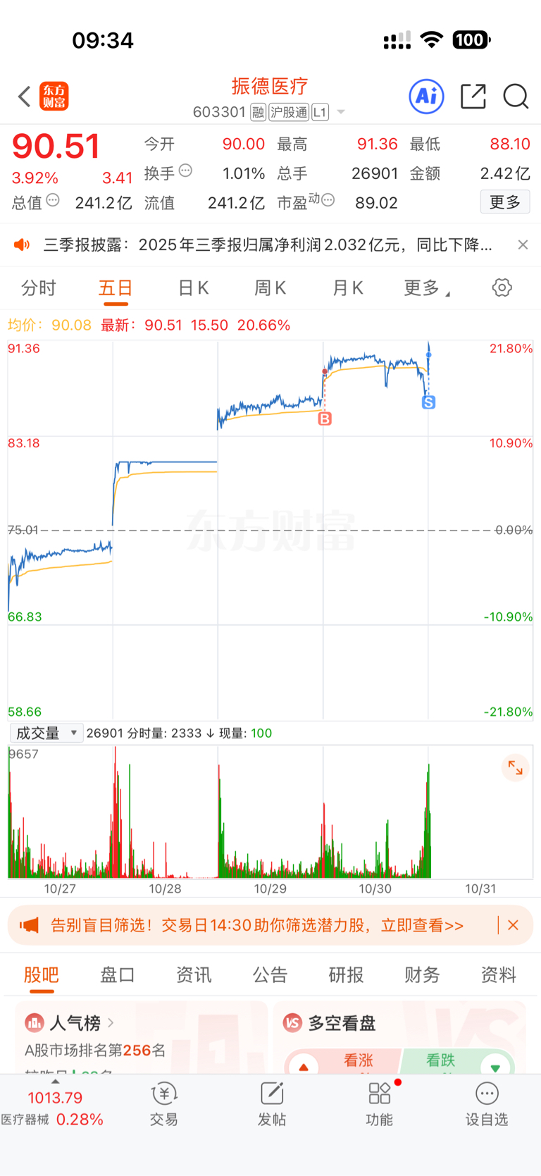 $振德医疗(SH603301)$ 昨天满仓买入,感谢给我开盘跑的机会