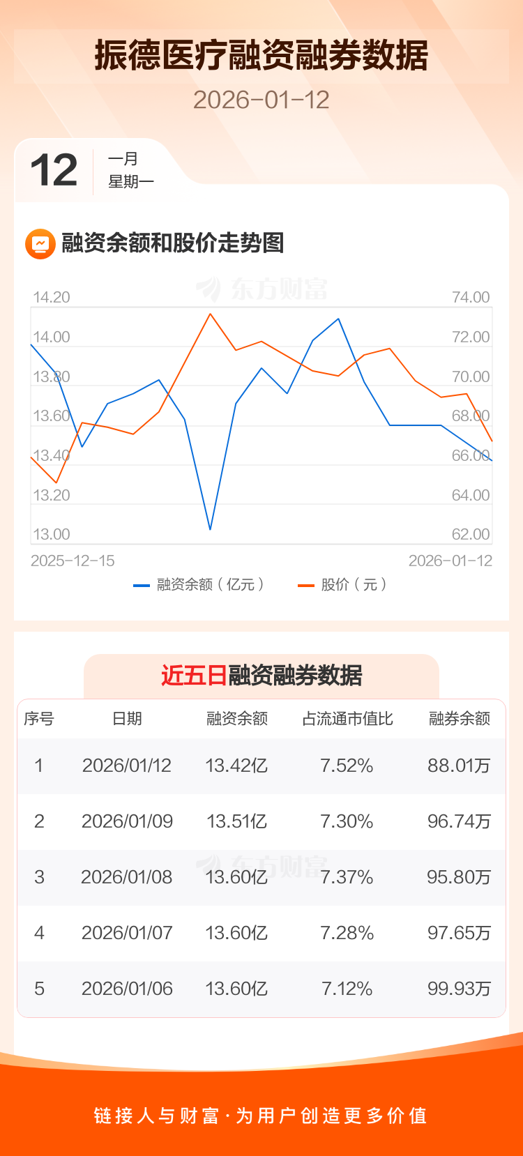 交易所最新数据显示,振德医疗于2026年1月12日获融资买入4046.43万元,融资偿还4938.38万元,当日融资净偿还891.95万元。目前,该股融资余额13.42亿,占流通市值比例为7.52%。