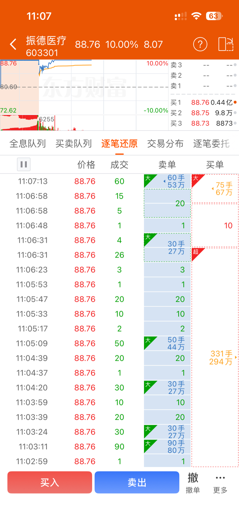 $振德医疗(SH603301)$ 逐笔还原可以看出一直有资金在跑,在漏单
