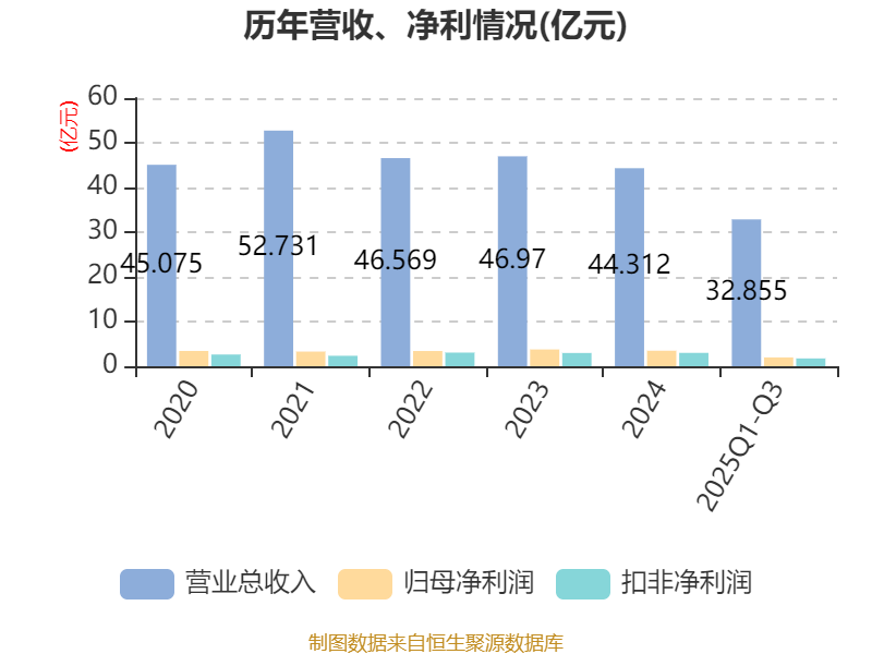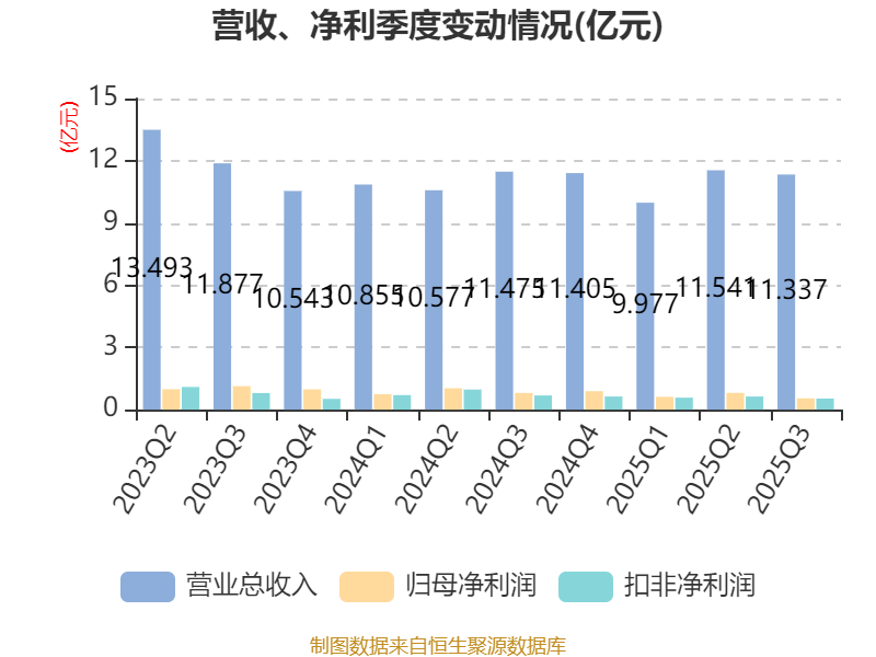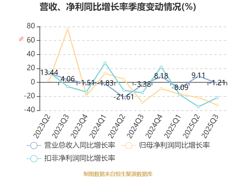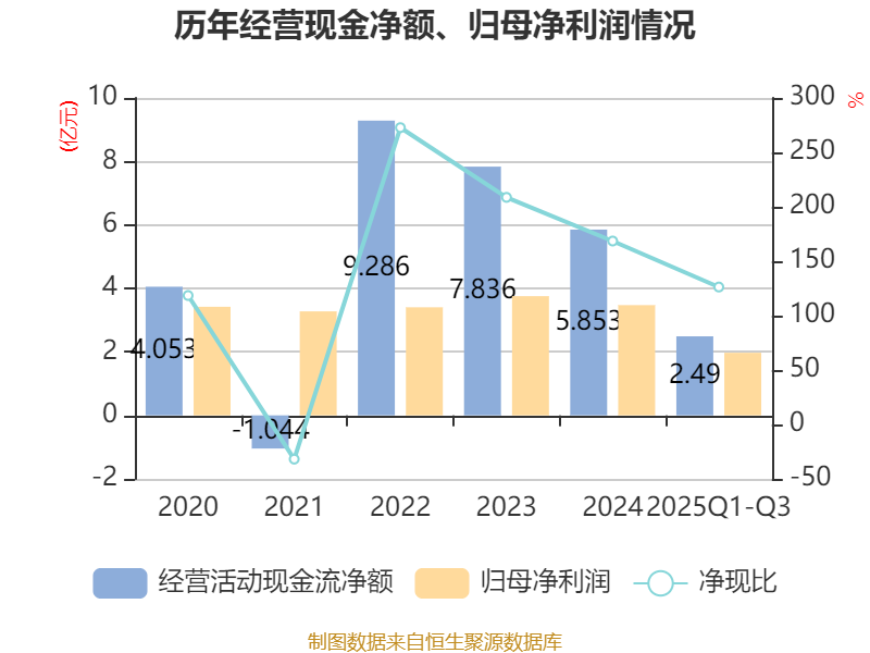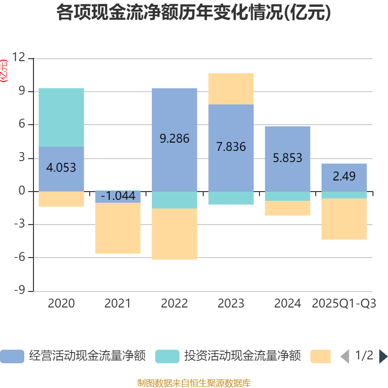 2025年前三季度,公司经营活动现金流净额为2.49亿元,同比增长109.95%;筹资活动现金流净额-3.69亿元,同比减少4.49亿元;投资活动现金流净额-6703.77万元,上年同期为-3.34亿元。