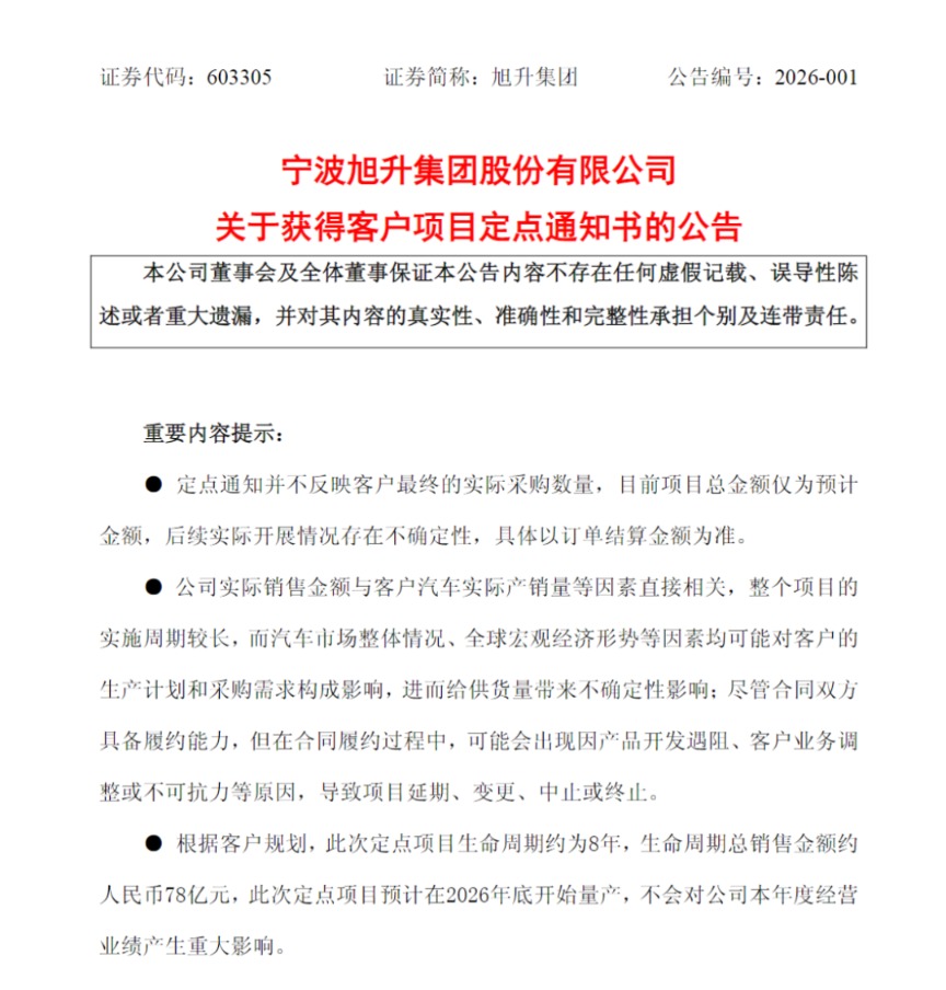1月5日盘后,旭升集团(603305)披露,公司于近日收到了北美新能源汽车厂商的定点通知,公司将为该客户供应动力总成、车身件、副车架、电池盒等零部件产品。根据客户规划,此次定点项目生命周期约为8年,生命周期总销售金额约人民币78亿元。