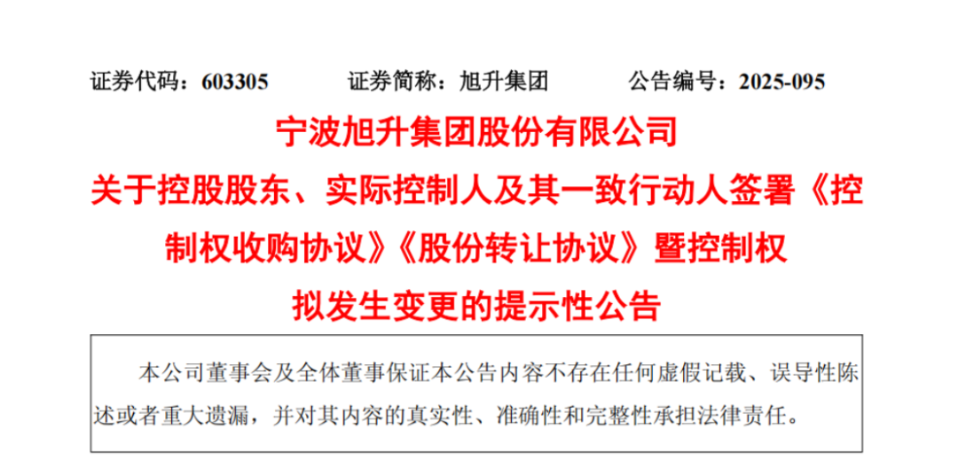 2025年12月22日,旭升集团披露公司控制权拟发生变更。通过股权转让和协议转让,公司控股股东将由徐旭东变更为广州工业投资控股集团有限公司(简称“广州工控集团”),公司的实际控制人将由徐旭东变更为广州市人民政府。交易总对价约42.95亿元。