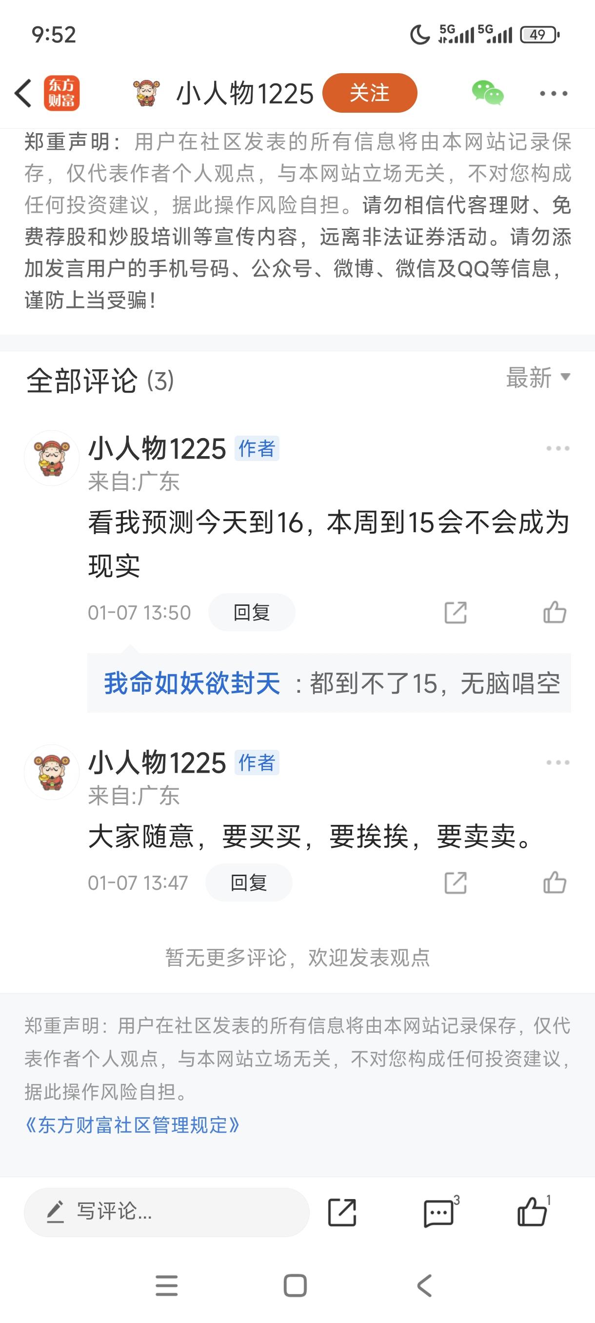 温馨提示: 1.根据《证券法》规定,禁止编造、传播虚假信息或者误导性信息,扰乱证券市场;2.用户在本社区发表的所有资料、言论等仅代表个人观点,与本网站立场无关,不对您构成任何投资建议。用户应基于自己的独立判断,自行决定证券投资并承担相应风险。《东方财富社区管理规定》