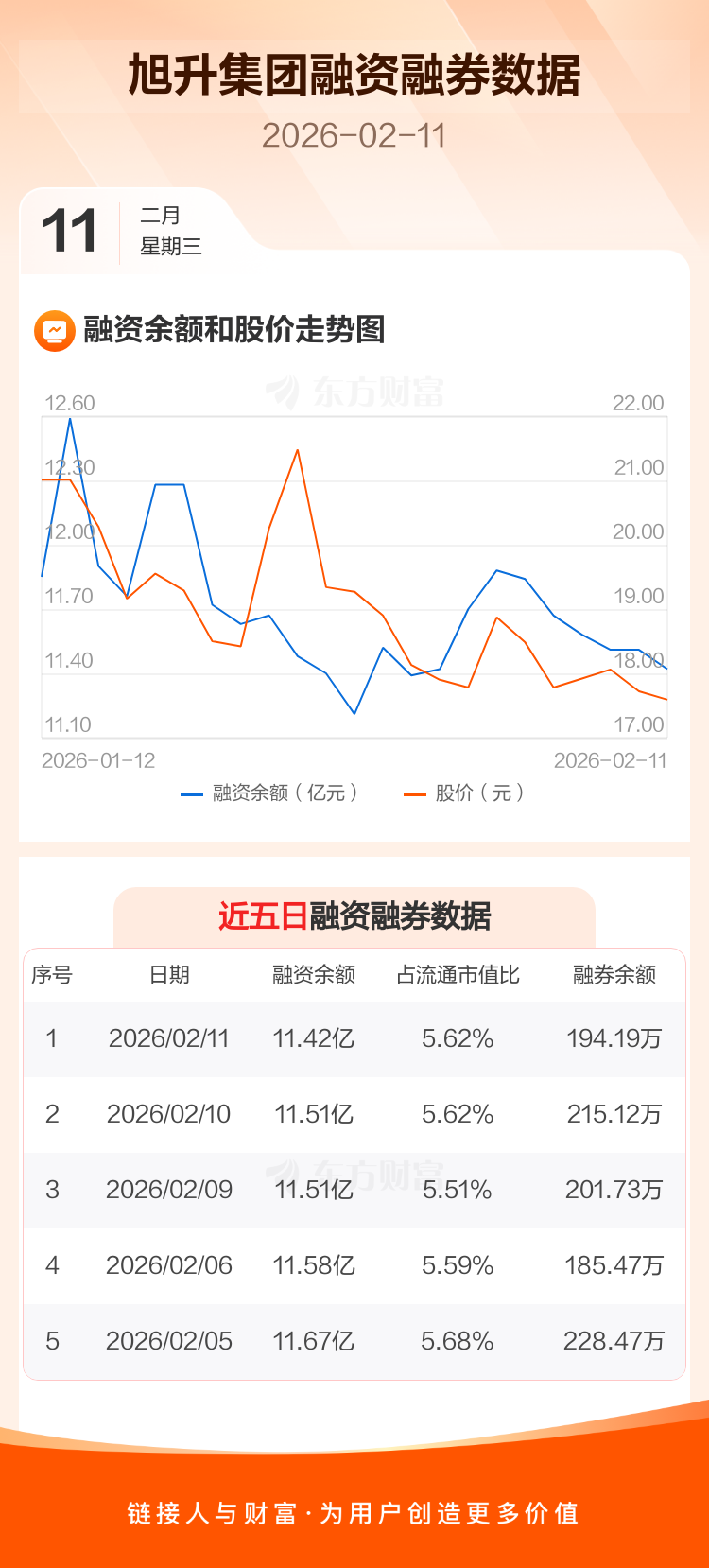 交易所最新数据显示,旭升集团于2026年2月11日获融资买入3760.67万元,融资偿还4658.72万元,当日融资净偿还898.05万元。目前,该股融资余额11.42亿,占流通市值比例为5.62%。