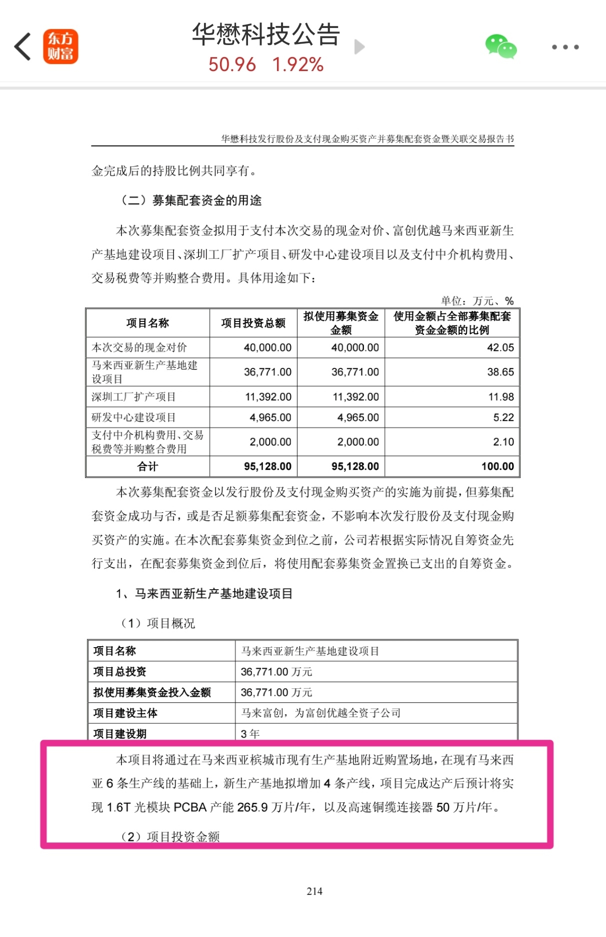 $华懋科技(SH603306)$ 高附加值项目来了,年产1.6T光模块PCBA合计365.9万片+高速铜缆连接器50万片!
