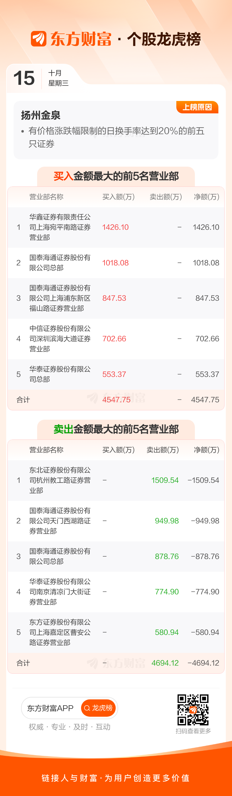 扬州金泉(603307)龙虎榜数据(10-15)