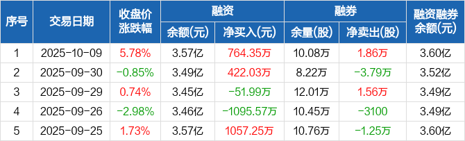 应流股份:融资净买入764.35万元,融资余额3.57亿元(10-09)