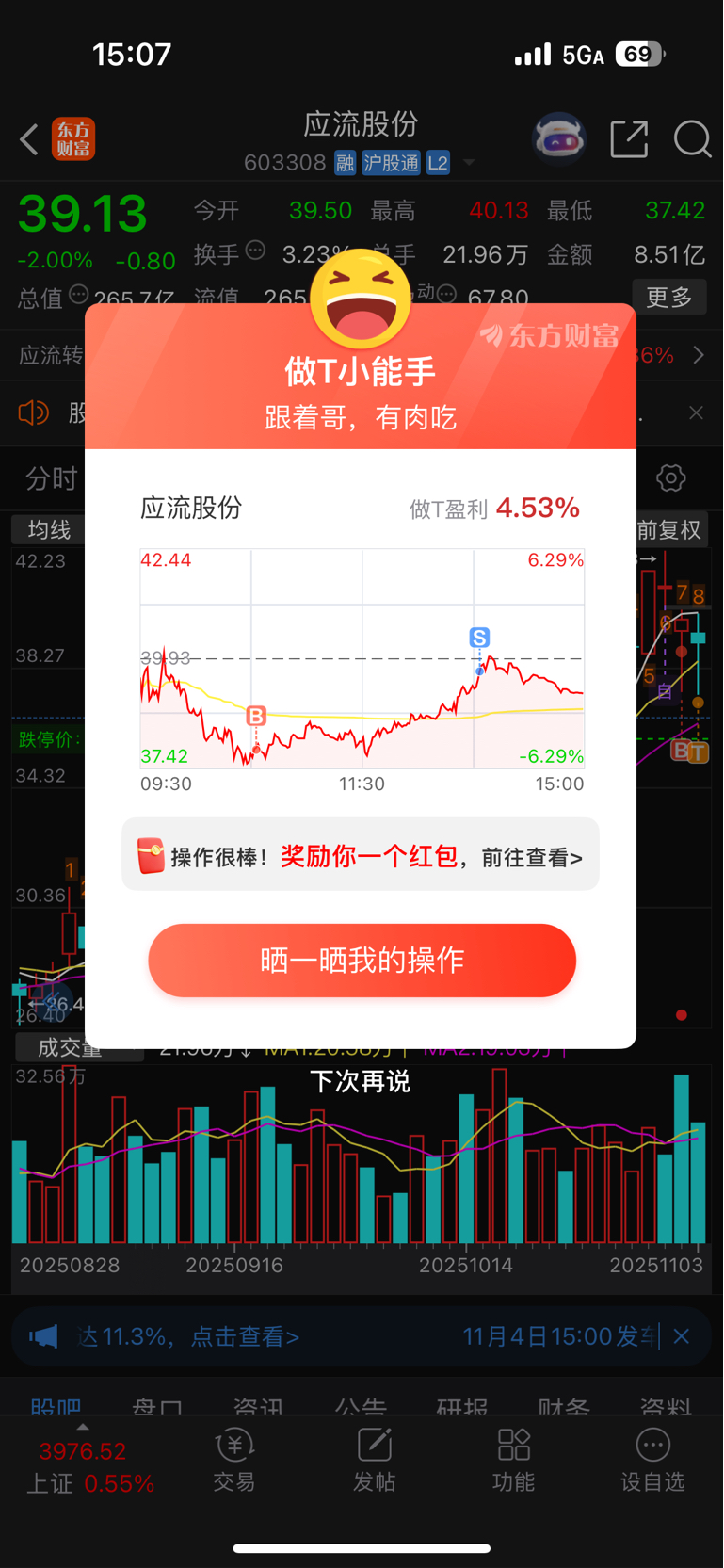 $应流股份(SH603308)$ $应流股份(603308)$ 这票沿着10日线走,上周五最低37.5,今天我看到37.5附近果然就被主力捞起,果断买入做t。这票已经三连阴了,一般很少阴超过3天。明天大概涨5个点,跟庄一起干