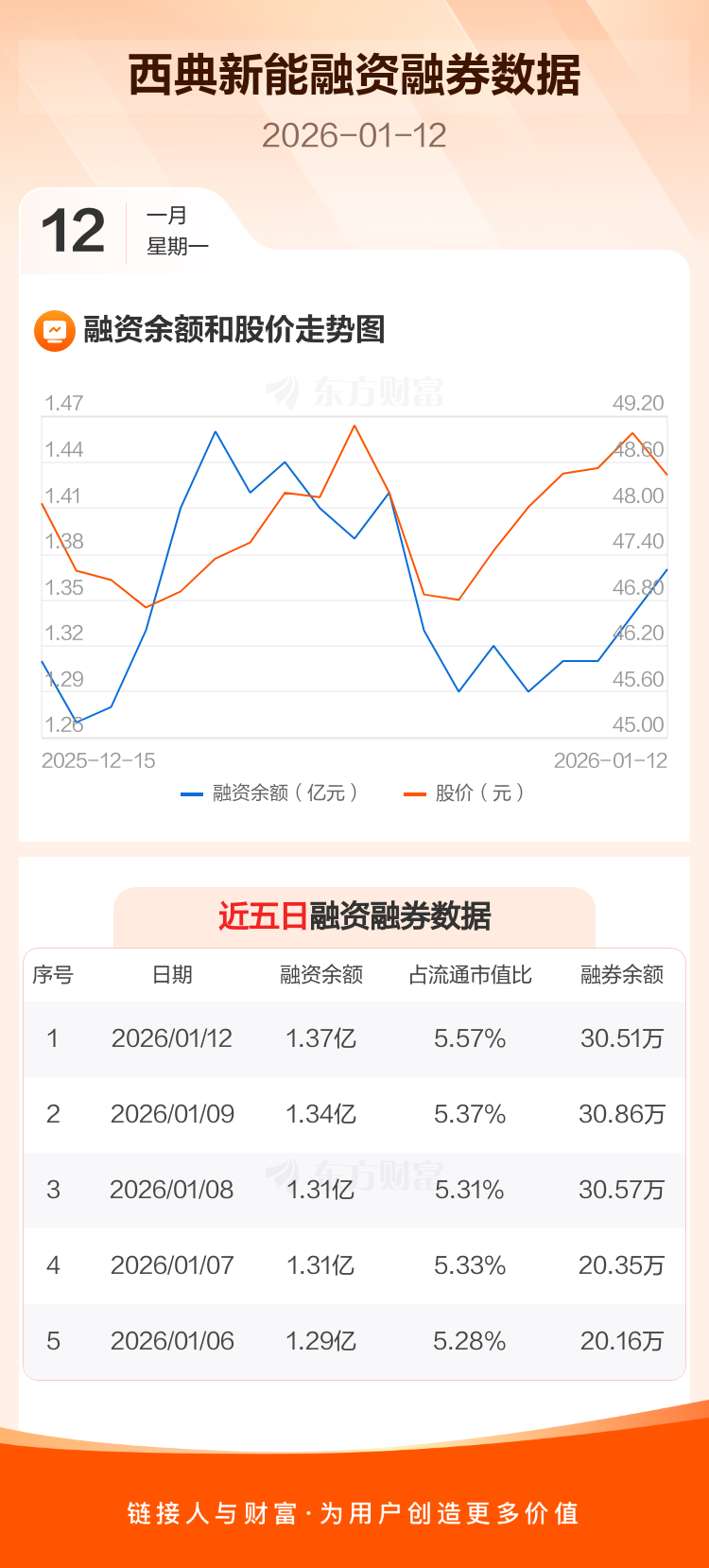 交易所最新数据显示,西典新能于2026年1月12日获融资买入1780.76万元,融资偿还1447.02万元,当日融资净买入333.74万元。目前,该股融资余额1.37亿,占流通市值比例为5.57%。