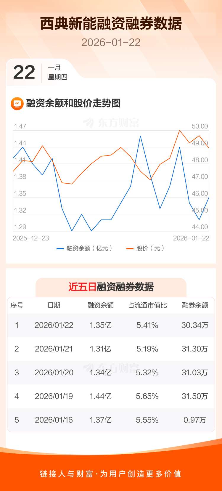 交易所最新数据显示,西典新能于2026年1月22日获融资买入2090.85万元,融资偿还1743.98万元,当日融资净买入346.86万元。目前,该股融资余额1.35亿,占流通市值比例为5.41%。