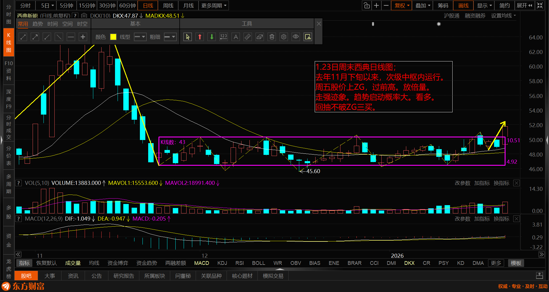 西典周五大阳线,站上中枢上轨,放倍量。走强迹象。