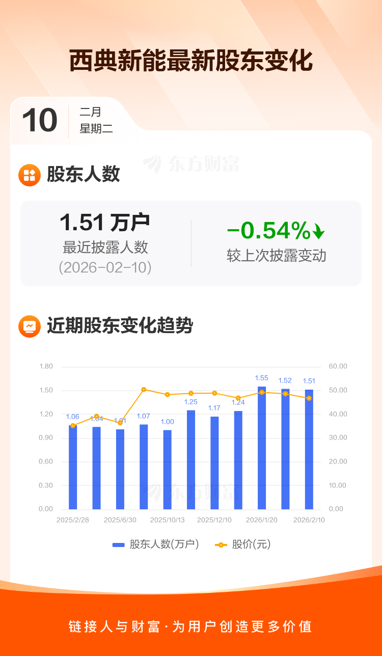 西典新能最新披露数据显示,截至2月10日公司股东户数为1.51万户,较上期(2026年1月30日)减少82户,降幅为0.54%。户均持有流通股数量由上期的3355股上升至3373股,户均持股金额由上期的16.31万元减少至15.75万元。