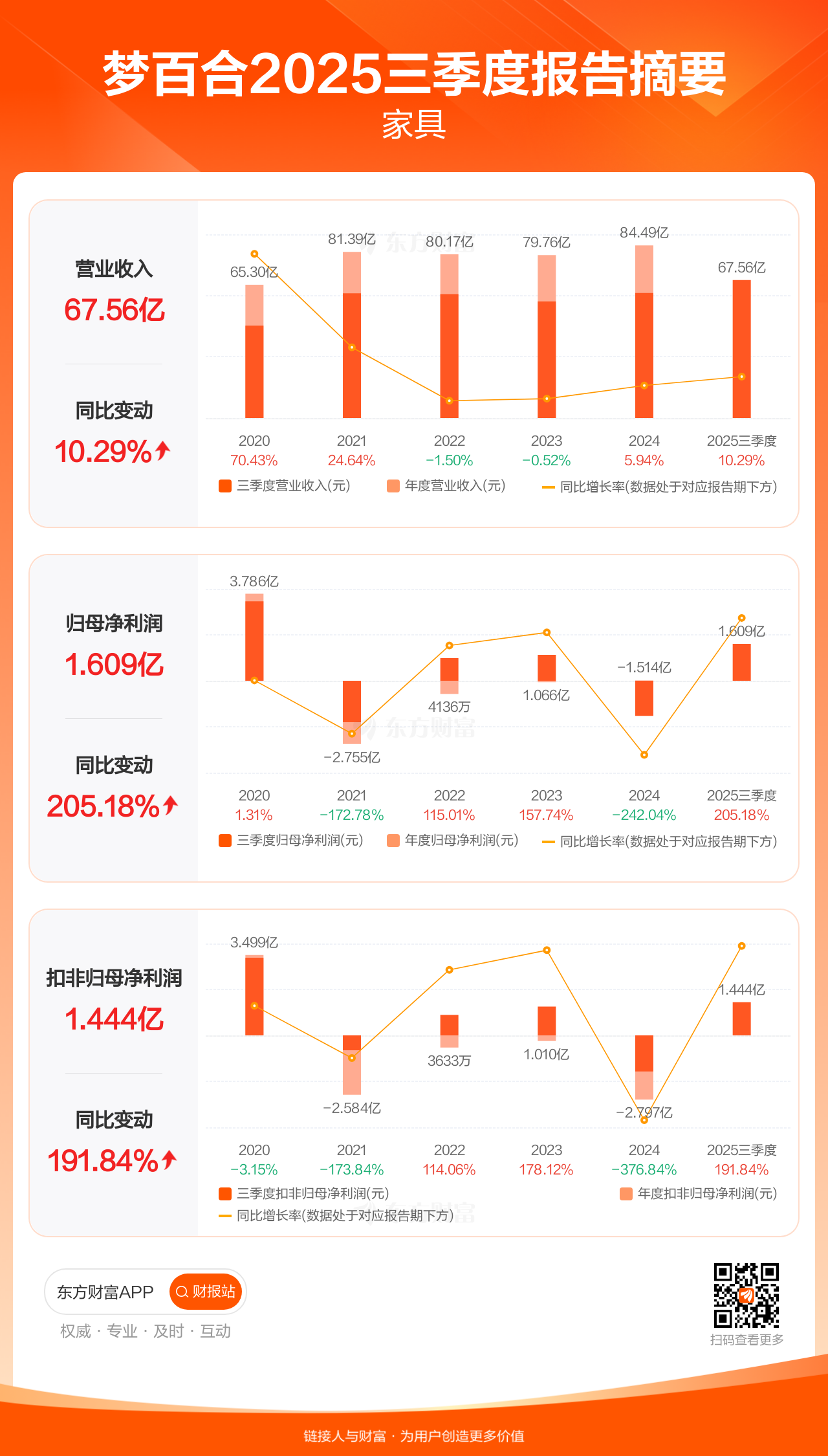 梦百合10月30日发布2025年三季报显示,公司前三季实现营业收入67.56亿元,同比增长10.29%;归母净利润1.61亿元,同比增长205.18%;扣非归母净利润1.44亿元,同比增长191.84%