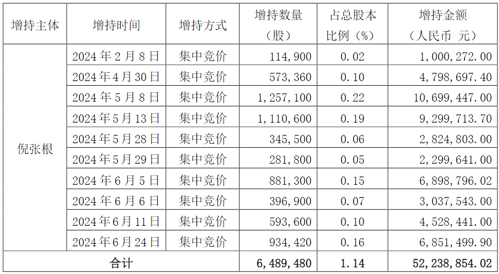 倪张根多次实施增持计划累计增持金额超过3亿元