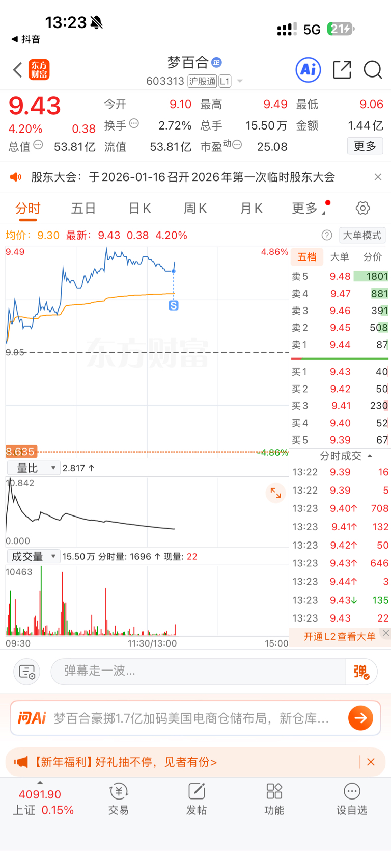 $梦百合(SH603313)$ 就盯我这三瓜两枣?