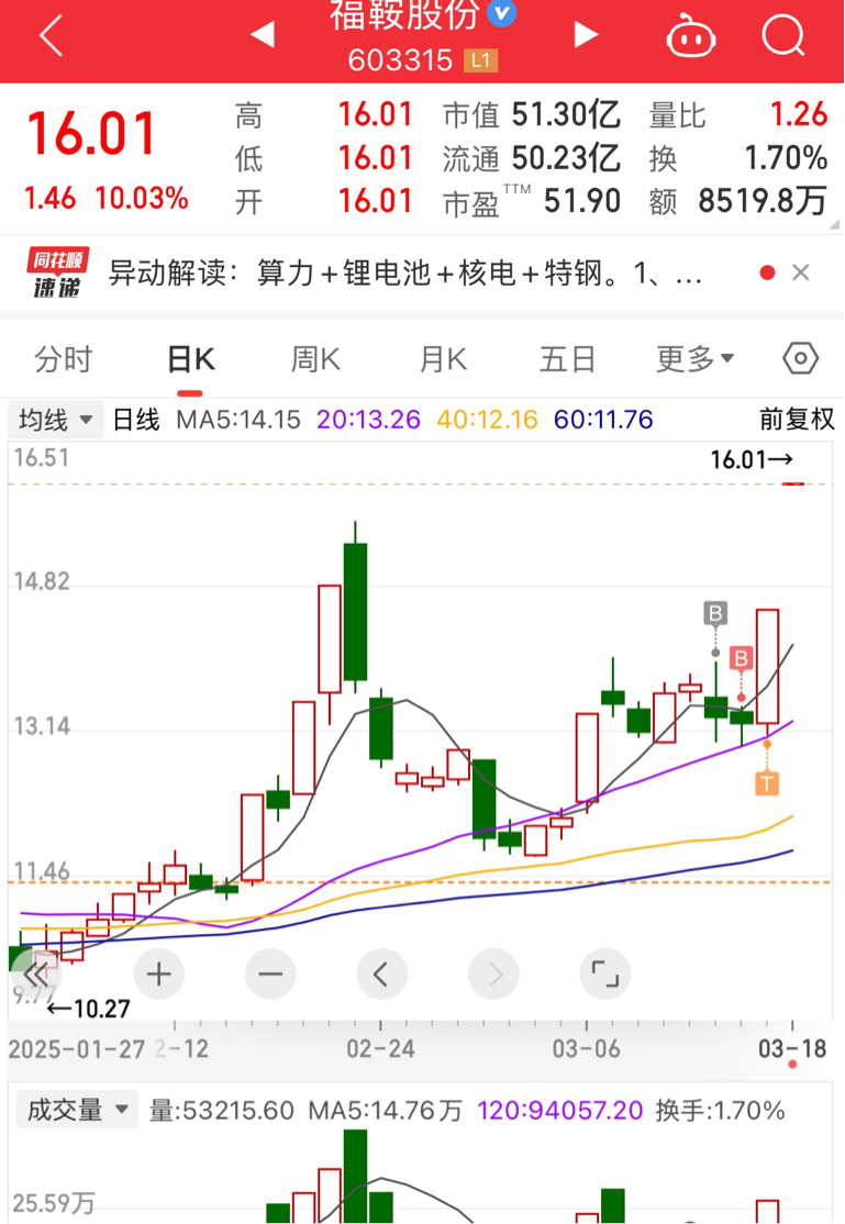 $福鞍股份(SH603315)$ 看到横到20日线了,又缩量就买了
