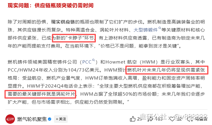 而导致北美电力燃气轮机其短缺的核心原因是:涡轮叶片产能紧缺!