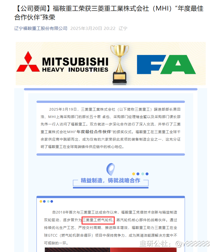 福鞍股份的价值爆发点,恰在于与三菱重工的深度绑定。2025年3月,福鞍重工从三菱重工全球千余家供应商中脱颖而出,成为仅有的六家"年度最佳合作伙伴"之一,这一奖项背后是自2018年合作以来,逐步晋升为燃气轮机、蒸汽轮机核心部件战略伙伴的实力积淀。