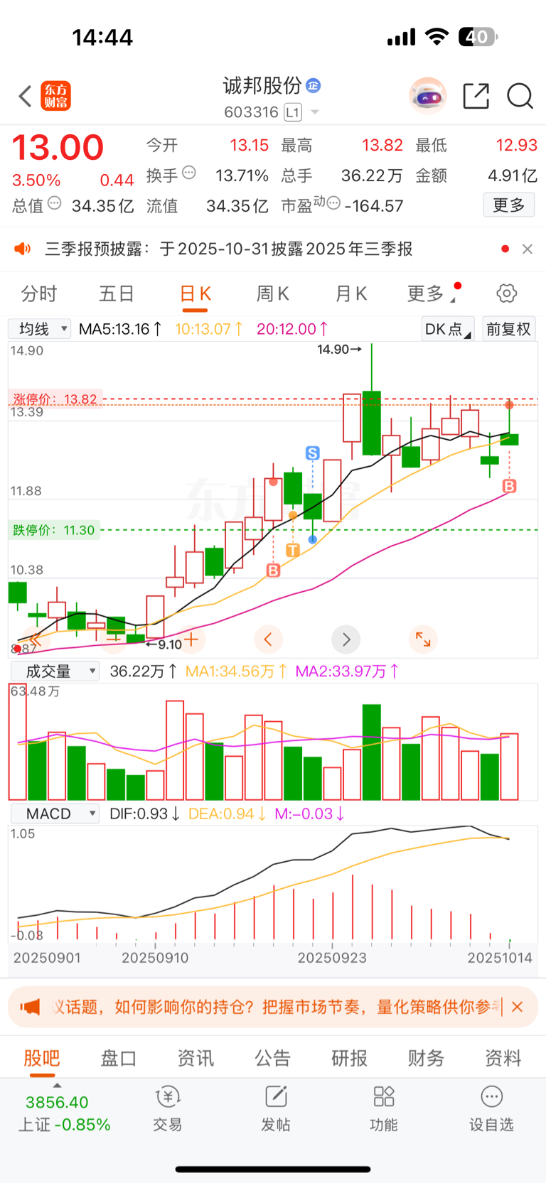 $诚邦股份(SH603316)$ 我一买你你就跌,涨停板都能跌下来