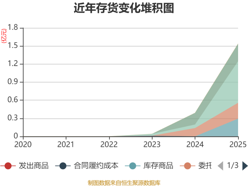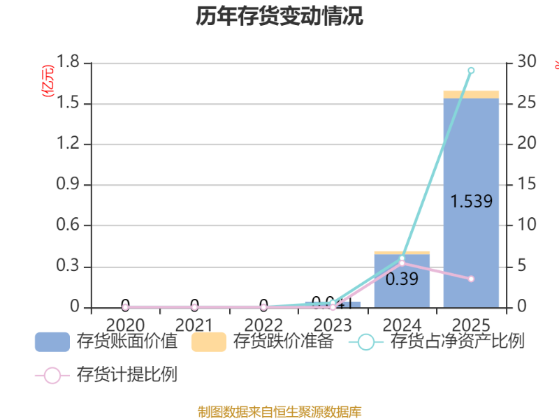 从存货变动来看,截至2025年末,公司存货账面价值为1.54亿元,占净资产的29.07%,较上年末增加1.15亿元。其中,存货跌价准备为555.16万元,计提比例为3.48%。