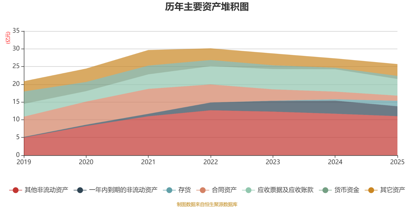 资产重大变化方面,截至2025年末,公司应收票据及应收账款较上年末减少25.32%,占公司总资产比重下降4.77个百分点;存货较上年末增加294.08%,占公司总资产比重上升4.56个百分点;一年内到期的非流动资产较上年末减少24.56%,占公司总资产比重下降2.68个百分点;合同资产较上年末减少32.62%,占公司总资产比重下降2.24个百分点。