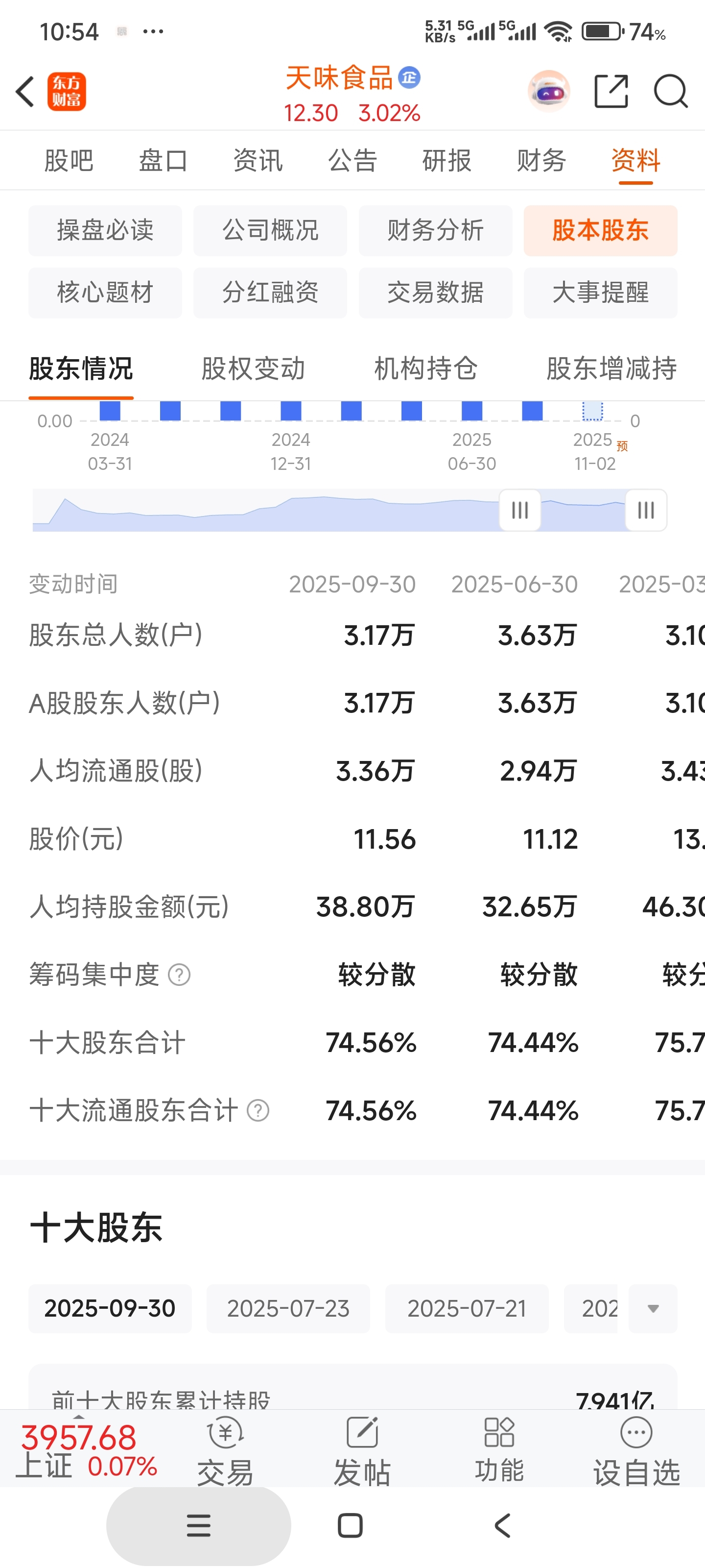 $天味食品(SH603317)$ 十大流通股占比74%。散户只占20%多。这个片要拉的话,轻轻松松的。