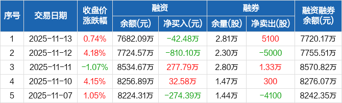 天味食品:融资净偿还42.48万元,融资余额7682.09万元(11-13)