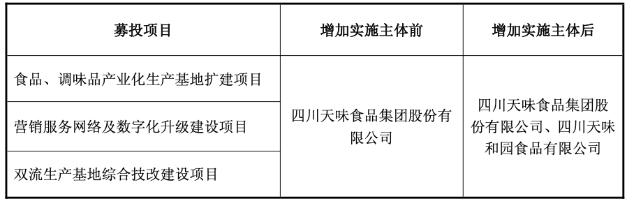 天味食品称,根据公司未来发展规划及产业布局,为整合公司业务和资产,优化资产结构,提高公司的经营管理效率,提升综合竞争力,提升募集资金使用效率,新增全资子公司天味和园作为上述募投项目的实施主体。