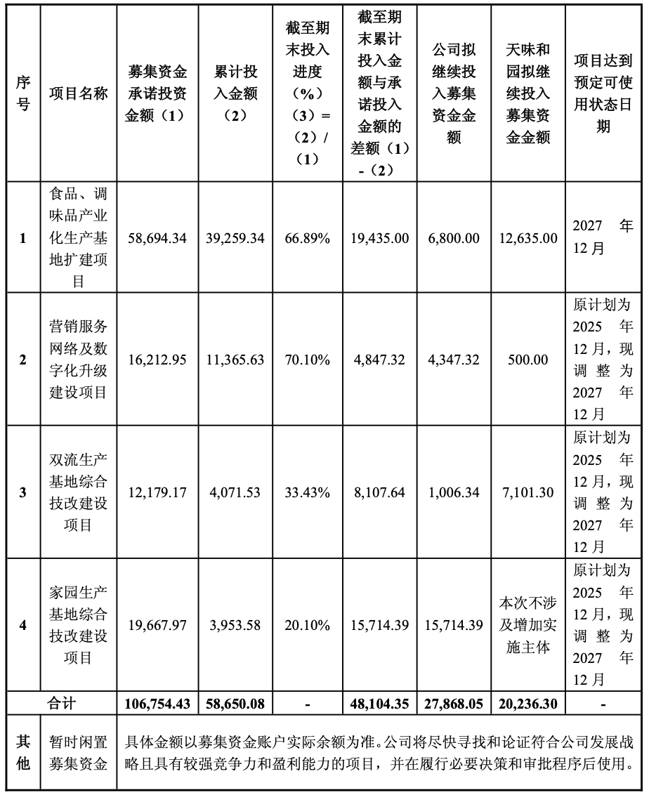 关于本次延期,天味食品表示,受经济环境调整、行业发展情况及终端市场需求波动等因素的影响,结合公司发展战略和经营规划,审慎调整“营销服务网络及数字化升级建设项目”“双流生产基地综合技改建设项目”“家园生产基地综合技改建设项目”整体投资进度,以及公司拟划转资产至天味和园,涉及部分募投项目需取得相关资质审批、权属安排,实施进度受划转进度的影响。根据行业需求和销售策略变化,经过综合分析和审慎评估,决定将“营销服务网络及数字化升级建设项目”达到预定可使用状态日期调整至2027年12月。