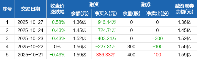 融资方面,当日融资买入913.7万元,融资偿还1830.14万元,融资净偿还916.44万元,连续4日净偿还累计2271.69万元。融券方面,融券卖出0股,融券偿还0股,融券余量0股,融券余额0元。融资融券余额合计1.36亿元。