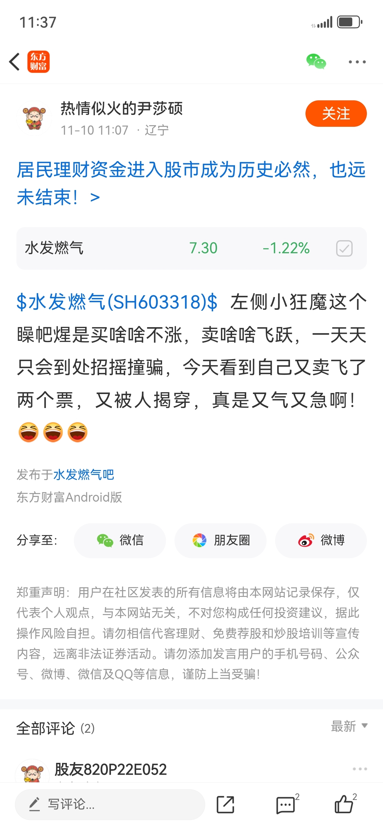 $水发燃气(SH603318)$ 萌新小白入股市,原来水发燃气贴吧真有拖啊,大家能告诉我,我是不是判断正确,这个左侧小狂魔有东财认证的实际持仓,而那个热情似火的是不是就是托,因为他没有实际持仓,你们说我这种判断是不是对的!