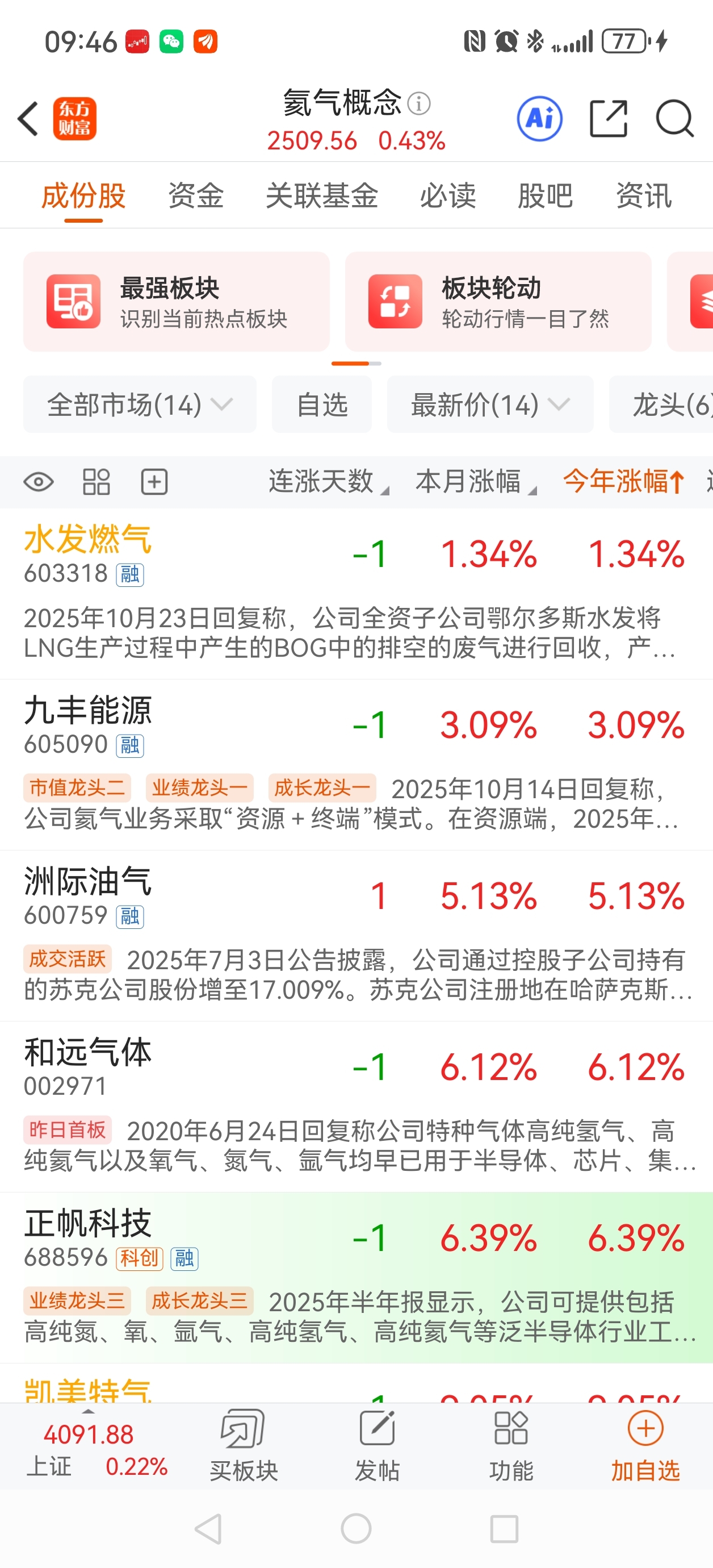 $水发燃气(SH603318)$ 氦气月涨幅倒数第一年涨幅倒数第一