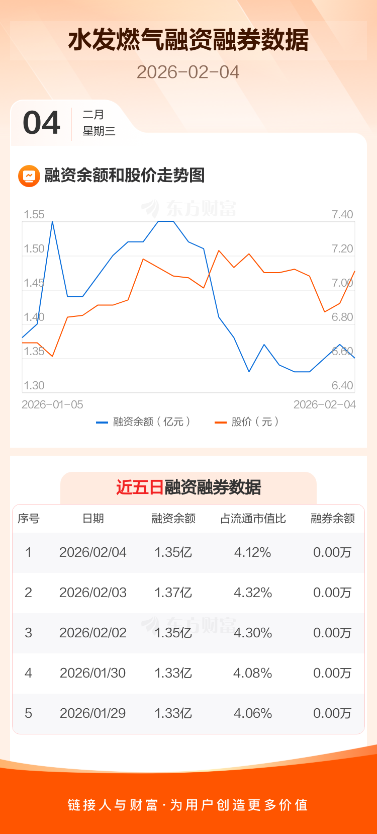 交易所最新数据显示,水发燃气于2026年2月4日获融资买入562.73万元,融资偿还847.69万元,当日融资净偿还284.96万元。目前,该股融资余额1.35亿,占流通市值比例为4.12%。