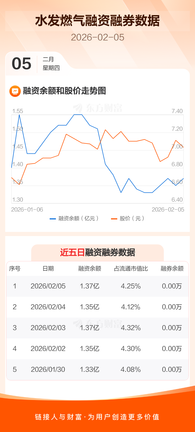 交易所最新数据显示,水发燃气于2026年2月5日获融资买入752.16万元,融资偿还480.21万元,当日融资净买入271.95万元。目前,该股融资余额1.37亿,占流通市值比例为4.25%。