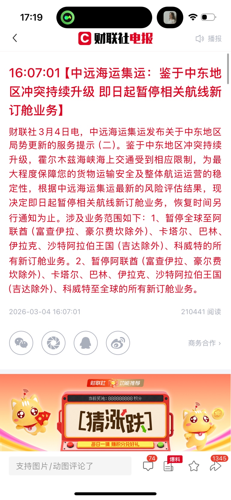 $水发燃气(SH603318)$ 中海官宣停运了!至此,全球前五大航运公司今天正式全面暂停波斯湾海运!说明短期内压根就不可能恢复了。供给端和运力大幅减少,那天然气和石油的价格必然还要继续涨,肯定是奔着破新高去的。