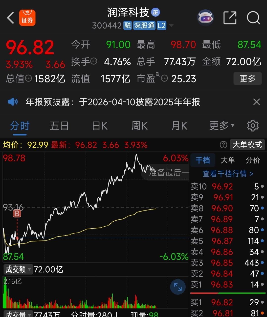 早上清仓此票,加仓算力租赁,还加仓了算力应用,仓位周末持股5成,早上低开加到9成,留一成机动,还没上融资。现在看来操作全部蒙对了